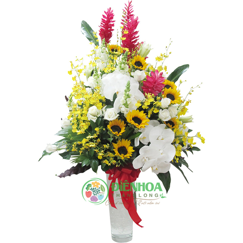 Bình hoa VIP chúc mừng được thiết kế kết hợp nhiều loại hoa cao cấp, sang trọng: lan vũ nữ, hoa hướng dương, hoa hồng, hoa hạnh phúc và điểm nhấn là những cành hồ điệp trắng. Những bông hoa lan sang trọng, quyến rũ trên nền hoa màu vàng tươi sáng. Bình hoa làm hài lòng cả những khách hàng khó tính nhất. Đây là quà tặng ý nghĩa chúc mừng lễ kỷ niệm, chúc mừng thăng tiến trong công việc … của người thân, đồng nghiệp, đối tác.