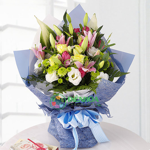 Sản phẩm bó hoa tặng mẹ gồm hoa ly hồng, hồng vàng, cát tường trắng, calimero xanh… Bó hoa đa đạng và rực rỡ như một khu vườn đầy màu sắc. Tất cả những bông hoa như nở rộ và cung nhau nổi bật trên nền giấy bọc, nơ trang trí được lựa chọn tinh tế và cầu kỳ. Phong cách bó hoa năng động, hiện đại phù hợp với xu hướng thẩm mỹ hiện nay.