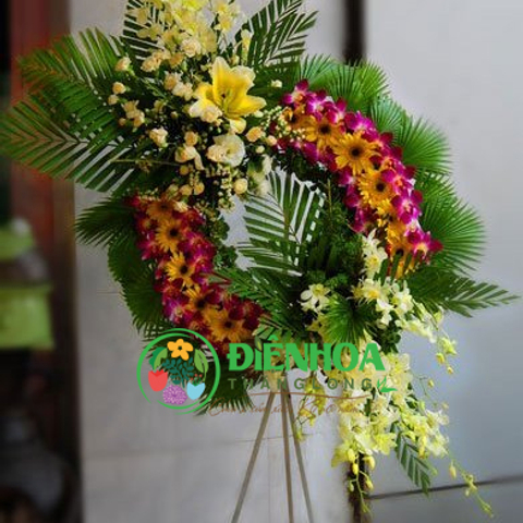 Sản phẩm gồm lan tím, lan vàng, ly vàng, đồng tiền vàng, được thiết kế với 2 cụm hoa đối xứng nhau tạo thành kệ hoa đẹp, lịch sự. “Sinh lão bệnh tử” là quy luật của đời người. Cuộc đời tuy rất dài nhưng cũng rất ngắn ngủi. Có những mất mát chúng ta không bao giờ tìm lại đươc khi người yêu thương đã rời xa chúng ta. Xin gửi điện hoa chia buồn để thay lời tiễn biệt người đã mất đến nơi bình yêu và chia sẻ sâu sắc với những người ở lại.