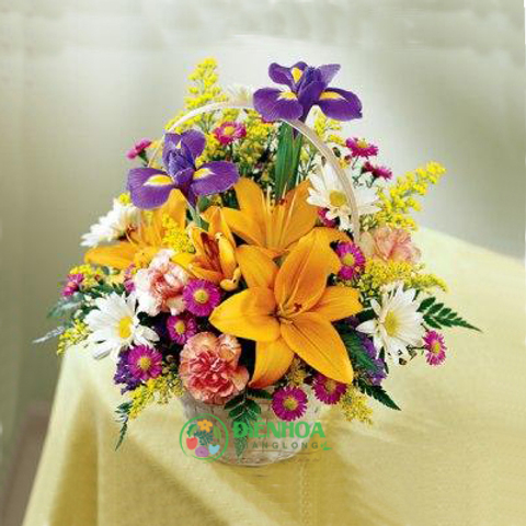 Giỏ hoa đặt bàn được thiết kế có màu sắc rực rỡ nổi bật từ những bông ly vàng, cúc trắng, cẩm chướng, vàng anh… Giỏ hoa dường như mang cả khu vườn xuân vào căn phòng, bàn làm việc của bạn. Sản phẩm thích hợp dành tặng ông bà, bố mẹ, đồng nghiệp để chúc mừng sinh nhật, kỷ niệm, ngày 8/3, 20/10…