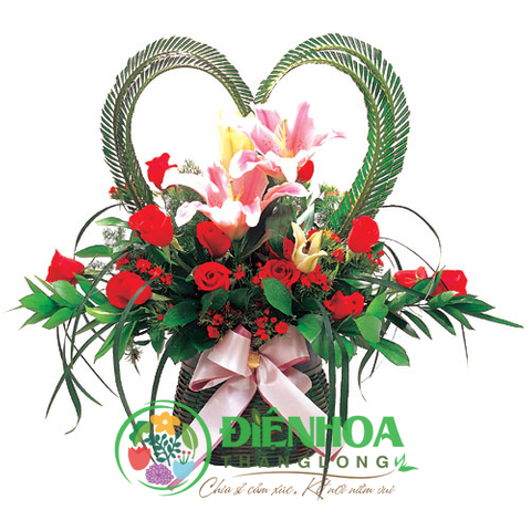 Sản phẩm giỏ hoa hình trái tim gồm hồng đỏ, ly hồng. Cách thiết kế độc đáo với hình trái tim từ lá xanh tạo sự ấn tượng, là điểm nhấn cho toàn bộ giỏ hoa. Màu sắc tươi sáng của hoa ly và hoa hồng mang lại cảm giác ấm áp, gần gũi. Sản phẩm thích hợp chúc mừng sinh nhật, kỷ niệm, … cho vợ/ chồng, bạn gái, người yêu…