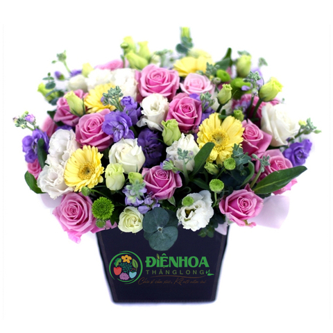 Giỏ hoa tổng hợp là giỏ hoa đặt bàn được thiết kế với hoa hồng, đồng tiền, cát tường, lá xanh… tạo thành tone màu rực rỡ, phù hợp hầu hết các dịp: sinh nhật, chúc mừng, hoa văn phòng… Tất cả các đơn hàng hoa tươi gửi về Việt Nam đều được tặng kèm một tấm thiệp xinh xắn, miễn phí. Bạn có thể ghi những lời chúc, lời nhắn nhủ yêu thương của mình tới người nhận.