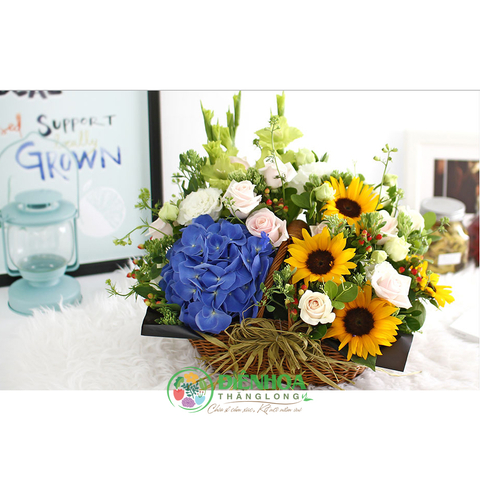Giỏ hoa tươi ngày mới gồm hoa hướng dương, hoa cẩm tú cầu, hồng phấn và các phụ liệu. Giỏ hoa với gam màu tươi sáng mang lại sự hứng khởi để bắt đầu một ngày làm việc mới. Tặng bạn bè, người thân giỏ hoa này là bạn đã mang đến cho họ niềm vui, sự may mắn, tốt đẹp cho ngày mới cũng như bạn đang tự mang niềm vui đến cho mình. Hãy làm ngày mới của bạn thêm niềm vui và yêu đời hơn khi trao tặng người thân, bạn bè của bạn những điều tốt đẹp. Hy vọng giỏ hoa này sẽ giúp bạn thêm nhiều ý tưởng để có ngày mới thật ý nghĩa.