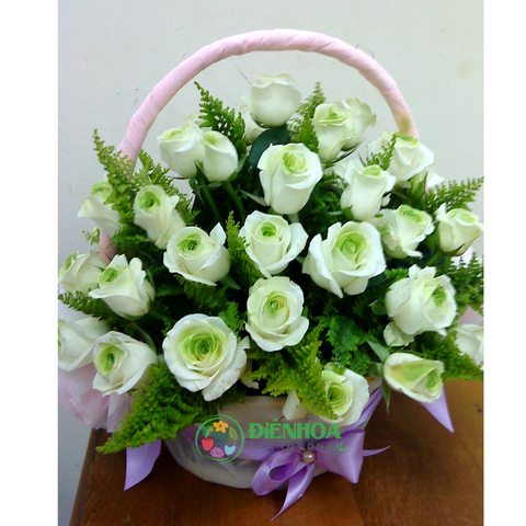 Giỏ hoa sinh nhật đẹp tặng bạn gái gồm hoa hồng trắng và phụ liệu. Giỏ hoa độc đáo bởi phía trong những bông hồng màu trắng được nhuộm màu xanh lá cây tạo nên vẻ đẹp trẻ trung, mang lại cảm giác bình yên giữa phố phường ồn ào, tâp nập.