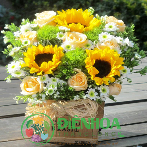 Hộp hoa sinh nhật gồm hoa hướng dương vàng, cúc xanh, cúc trắng, sử dụng hộp gỗ đơn giản tạo cảm giác mộc mạc. Những bông hoa phối hợp hài hòa tạo thành giỏ hoa xinh xắn, như mang những tia nắng nhẹ nhàng như ấm áp. Giỏ hoa thích hợp làm quà tặng cho bất cứ dịp nào: chúc mừng sinh nhật, chúc sức khỏe, mừng bé chào đời…
