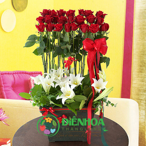 Lẵng hoa đẹp gồm hoa hồng đỏ, ly trắng… được cắm trong hộp gỗ sang trọng. Những bông hồng đỏ cắm cao như ước mơ, khát vọng vươn xa của những người đàn ông trong gia đình còn những bông ly trắng tinh khôi nhưn những người phụ nữ đức hạnh, sắt son. Tình yêu được nuôi dưỡng khi có sự hòa quyện, cố gắng của hai người. Giỏ hoa mang ý nghĩa về hạnh phúc đong đầy.
