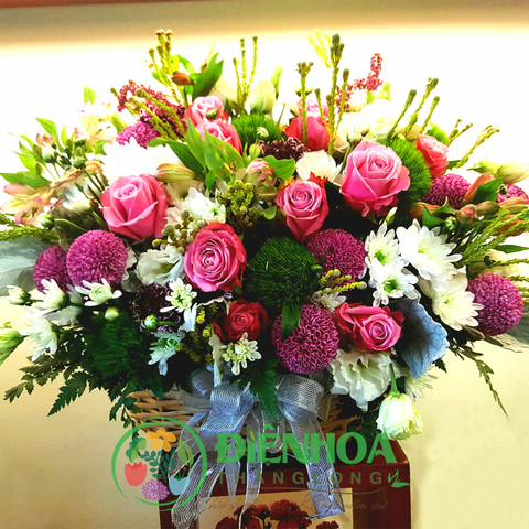 | Hoa chủ đạo | Hoa hồng tím, cúc ping-pong tím, thủy tiên, cúc trắng, green wicky và phụ liệu nhập khẩu |