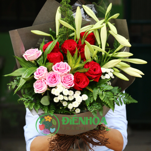 Hoa loa kèn được kết hợp với hoa hồng đỏ và hoa hồng trà tạo nên một bó hoa nhẹ nhàng, bình dị. Bó hoa phù hợp tặng bạn gái trong dịp sinh nhật, lễ kỷ niệm hay một ngày đẹp trời nào đó của tháng tư.