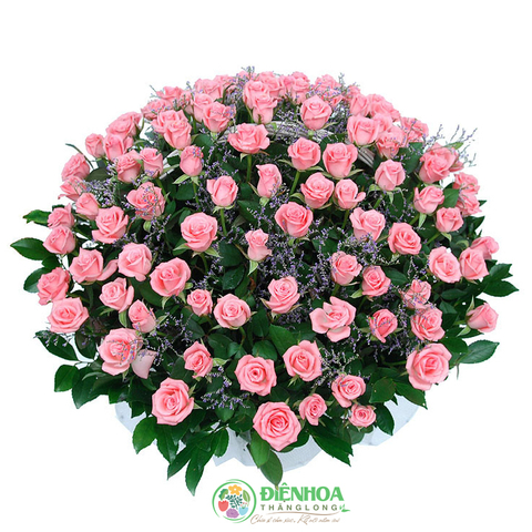 Sản phẩm gồm 100 bông hồng phấn, sao tím tạo thành vườn hồng quyến rũ. Giỏ hoa được cắm tròn với gam màu trang nhã, thích hợp cho hầu hết các dịp chúc mừng thân mật, hoa tình yêu, hoa mừng ngày 8-3…