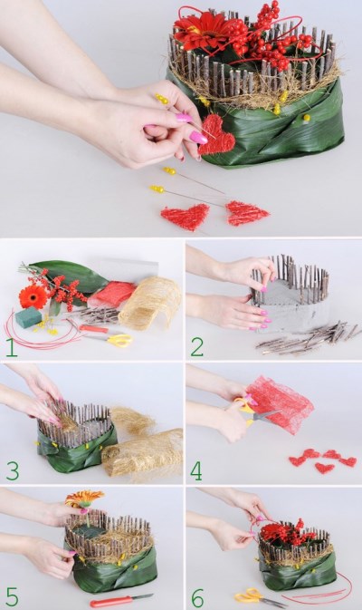 – Cắm cành hoa đồng tiền vào bên trái của trái tim cùng với 3 cành quả đỏ. Tiếp theo, bạn cắt kẽm màu đỏ thành 5 đoạn ngắn, uốn cong lại rồi cắm trang trí quanh hoa đồng tiền. Cuối cùng, bạn cắm trang trí các trái tim màu đỏ bên ngoài khối xốp là xong.